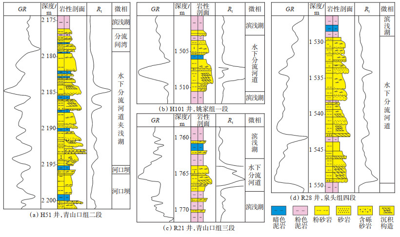 泉头组四段、青山口组三段和姚家组沉积时期湖泊水体较浅,其沉积作用以滨浅湖和分流河道沉积为主,因此浅湖型三角洲普遍发育。青山口组一、二段沉积时期,物源主要来自西南的保康水系;至青三段沉积时期,西南物源供给不充分,西北方向的英台水系物源供给增加。青三段分流河道是砂岩沉积的主体,岩性较细,以细砂岩、粉砂岩为主,单砂层厚为2~5 m;分流河道间有越岸的粉砂岩沉积,紧邻分流河道呈条带席状分布,厚度一般 < 1 m。“浅湖型”三角洲垂向沉积序列不完整[图 3(b)-(c)],为分流河道与滨浅湖交互沉积,夹薄层席状砂坝,河口坝不发育,测井曲线组合往往呈指型或漏斗型。