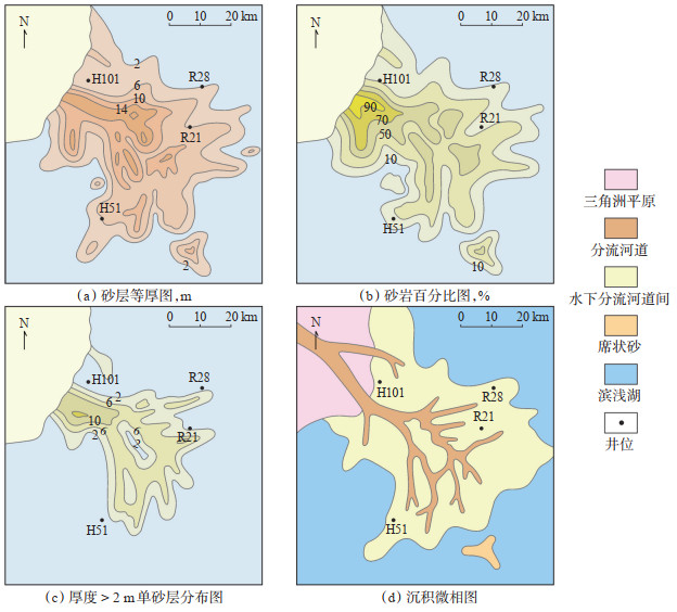 (2) 松辽盆地南部保乾三角洲(上白垩统泉头组—嫩江组)由深湖型与浅湖型2种三角洲构成。深湖型三角洲主要发育于湖侵期,三角洲平面形态一般呈朵叶状,沉积微相以水下分流河道、河口坝和分流间湾为主;浅湖型三角洲广泛发育于湖退期,三角洲形态一般呈鸟足状或树枝状,相带分异不明显,沉积微相以分流河道和分流河道间为主,其中分流河道在平面上呈结网状展布。