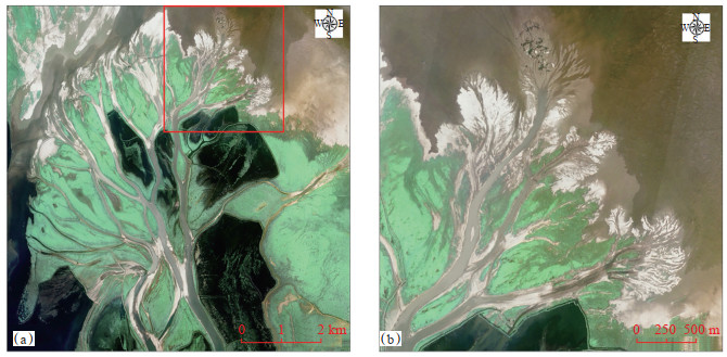 在强枯水期部分三角洲前缘相带出露水面,在洪水期则全部淹没于水下。分流河道向湖中延伸的部分继续分叉,分化为更小更多的水下分流河道。三角洲前缘相带向湖延伸10~20 km。在整个鄱阳湖盆地内,未见到典型的河口坝沉积,推测在此三角洲的近代发育史中,即使偶有河口坝发育,也会很快被分流河道改造而未能保留下来。野外考察证实,细沙主要沉积在分流河道中,在不同尺度下的影像上均可观察到此特征(图 6);分流河道外的天然堤和越岸沉积以粉—细沙为主,但分布范围有限。三角洲前缘外带发育小型河口坝和席状沙,厚度较薄,以粉沙为主,推测随着后期分流河道不断向湖延伸而被改造,不易完整地保留下来。