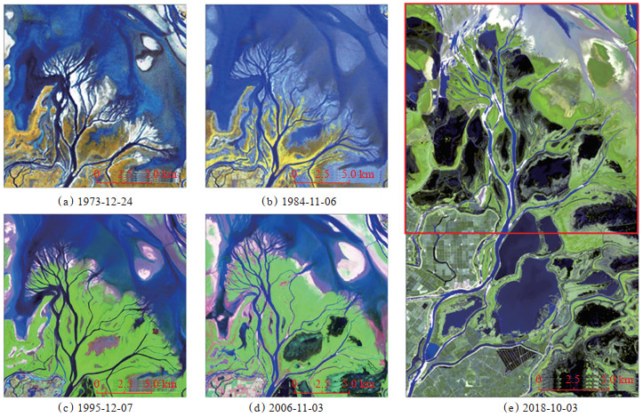 3.2 赣江中支三角洲发育演化与结网状骨架沙体的形成赣江在南昌附近分叉后,最终以南支、中支、主支和北支等4支汇入鄱阳湖。枯水时节赣江北支汇入中支,途经中支前缘朵体后进入鄱阳湖,赣江中支前缘朵体是近年来生长最快且保存完好的三角洲朵体(图 7)