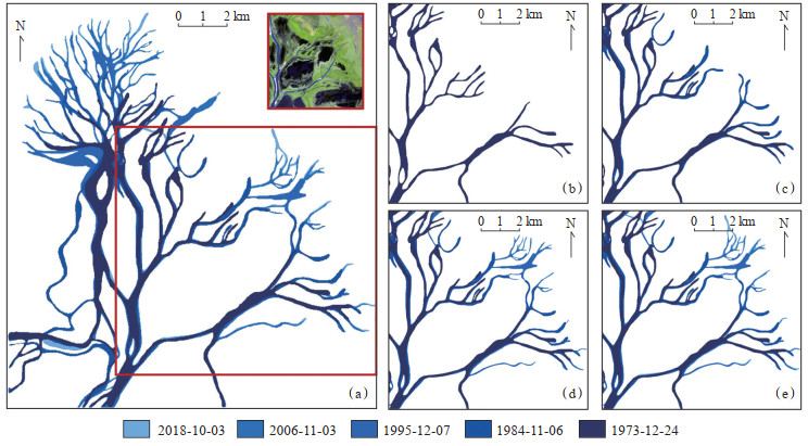 下载原图 图 7 鄱阳湖赣江中支三角洲不同年代遥感解析 (a),(b),(c),(d)的位置见(e);(e)的位置见图 2(a) Fig. 7 Remote sensing images of Ganjiang middle delta in Poyang Lake in five years |