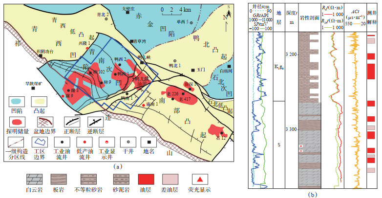 下载原图 图 1 酒西盆地鸭儿峡油藏勘探成果(a)和综合柱状图(b) Fig. 1 Reservoir exploration results(a)and comprehensive log interpretation(b)in Ya'erxia, Jiuxi Basin |