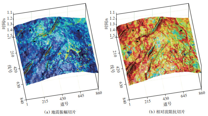 对比原始地震数据和滤波后的地层相对波阻抗的频谱特征(图 9)可知,地层相对波阻抗频谱的有效频带较宽,这对薄储层勘探具有重要意义。在此基础上开展地震振幅和相对波阻抗的切片对比,结果如图 10所示,地层相对波阻抗切片对研究区内地质体沉积特征(河道)较地震振幅表征得更加清晰、准确。