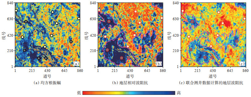 由于地震分辨率和反射波邻层干涉效应的影响,地震均方根振幅[图 12(a)]对层厚小于地震波长一定比例的薄层的刻画能力通常不足。相比之下,由于地层相对波阻抗在计算过程中降低了地震邻层干涉效应的影响,同时亦拓宽了资料有效频带,因此其对薄储层的刻画能力更强[图 12(b)]。图中地震均方根振幅与研究区12口井数据的匹配率为67%,地层相对波阻抗匹配率为83%,符合率提高了近1/4。图 12(b)-(c)对比了计算的地层相对波阻抗与联合测井资料所预测的地层波阻抗,由图 12(c)可以看出,油井基本位于低阻区域而水井或干井位于高阻区域。将图 12(c)中刻画的波阻抗边界平移至图 12(b)的相对波阻抗切片上,观测可知,该边界亦能基本区分地层相对波阻抗的高低波阻抗区域,验证了本次研究方法的有效性,为薄储层精细勘探提供了重要参考信息。