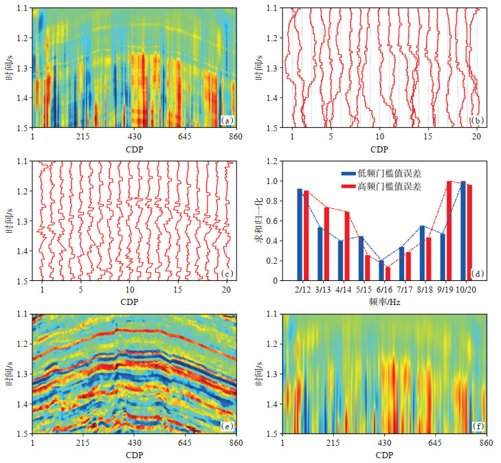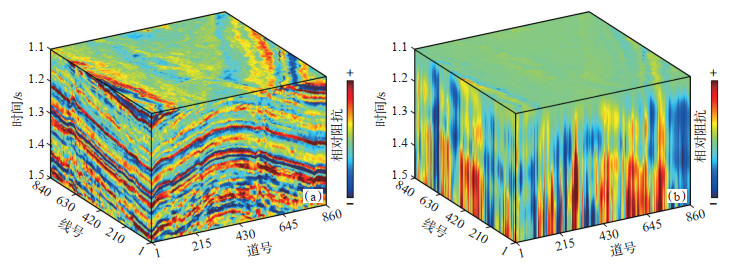 由图 7(a)可知,原始相对波阻抗剖面几乎无法表征研究区的地层叠置关系,由于低频累积误差的存在,图 7(b)中相对波阻抗曲线(红色)趋势基本受低频累积误差(黑色)控制,不能有效突出其所蕴含的地层信息。经过滤波处理后,滤除低频误差后的相对波阻抗曲线[图 7(c)]对地下地层的表征能力得到明显提升。基于设计的线性FIR滤波器,通过参数试验[图 7(d)]选择最佳滤波参数开展高通滤波,处理后的地层相对波阻抗剖面[图 7(e)]能够清晰地展现地下地层在垂向上和横向上的展布特征,滤除的低频累积误差如图 7(f)所示。图 1中地震数据体包含近73万道数据,完成相对波阻抗计算和高通滤波处理共计用时15 s,验证了算法的高效率,滤波处理后的相对波阻抗体如图 8(a)所示,图 8(b)为对应的低频累积误差。