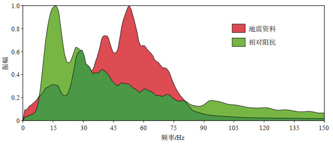 下载原图 图 9 地震资料与地层相对波阻抗频谱特征对比 Fig. 9 Comparison between the frequency spectra of seismic data (red) and of relative impedance (green) |