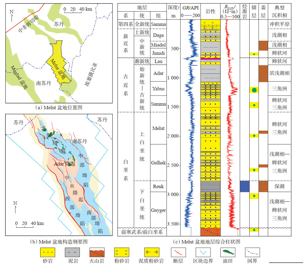 1 地质概况Melut盆地位于南苏丹境内,是中非剪切带走滑背景下所形成的一个中—新生代裂谷盆地[19][图 1(a)],盆地面积3.3万km2,平面上具有“四坳两隆”的构造格局[图 1(b)],剖面上具有“西断东超”的特征。Melut盆地的主要勘探发现集中于北部坳陷,目前已发现原油储量约8.5亿t(62亿桶),是一个典型的富油坳陷[20]。Melut盆地的构造演化经历了早白垩世、晚白垩世和古近纪等3幕裂陷作用,后又经历了新近纪以来的坳陷阶段[21][图 1(c)]。新近系Jimidi组岩性以厚层含砾中—粗砂岩为主,夹薄层棕红色泥岩,为坳陷期河流相沉积[22]。