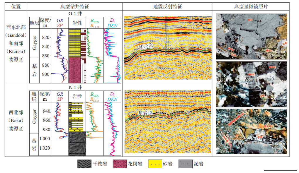 下载原图 图 2 Melut盆地不同物源区基岩的岩性特征及地震响应 Fig. 2 Lithologies and reflection features of basement in different provenances, Melut Basin |