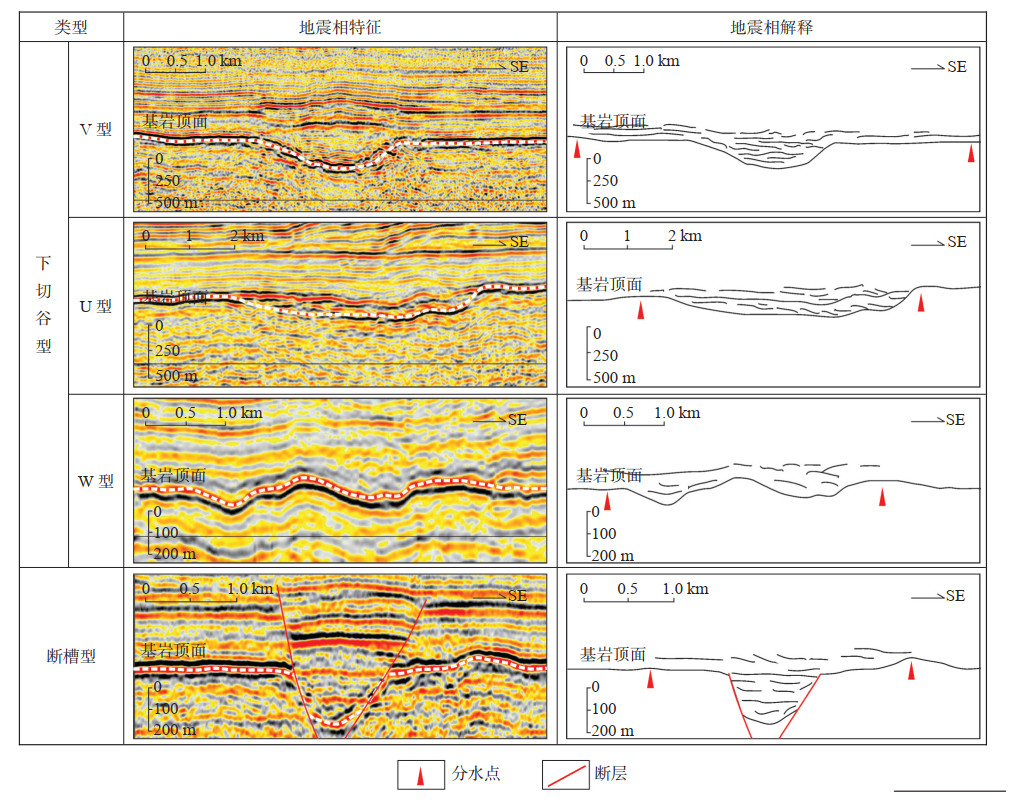2.2 搬运体系搬运体系是连接源区与沉积区之间的桥梁,是向盆内输送沉积物的渠道。基于盆缘区二维地震剖面解释结果,总结出Melut盆地Jimidi组沉积时期的4种典型搬运通道类型,分别为下切谷型的V型、U型、W型和断槽型(图 4)。V型下切谷主要发育于地形坡度较陡、构造沉降量较大的东北部Gan‐ dool地区,具有下切作用强、水动力条件强的特点,地震剖面上可见其外部形态近似对称;定量统计结果显示,研究区的V型下切谷的总体分布频率仅为15%,宽度为0.8~1.5 km,深度为150~250 m,宽深比为5,说明坳陷期V型下切谷虽存在,但并非主体搬运通道类型。U型下切谷发育于构造沉降量偏低、地形坡度偏缓的西北部Kaka地区,具有“宽浅”特征,内部充填物表现为垂向和侧向叠加样式,反映水道频繁侧向迁移。定量统计结果显示,研究区的U型下切谷的总体分布频率约为30%,宽度为1~ 4 km,深度为120~180 m,宽深比为20,是坳陷期主体搬运通道类型之一。W型下切谷主要发育于仅受整体构造沉降影响的西南部Tean地区和西北部Kaka地区,通常具有不对称外部形态,内部充填物表现为侧向加积样式。定量统计结果显示,研究区的W型下切谷的总体分布频率为50%,宽度为0.5~1.2 km,深度为100~150 m,宽深比为10,也是坳陷期主体搬运通道类型之一。断槽型搬运通道的两侧或一侧受断裂控制,通常具有窄、深、限制性强的特点,Jimid组沉积时期,盆地整体处于坳陷期,断裂活动弱,断槽型搬运通道仅局限分布于Gandool地区,分布频率仅为5%。就相同物源区而言,从上游到下游,搬运通道类型通常由断槽型和V型为主,逐渐演变为以U型和W型为主。