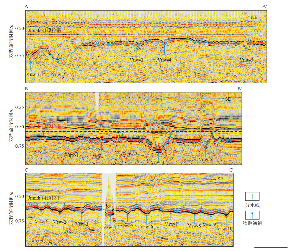 三大物源区的搬运通道定量统计结果显示(图 5),西北部Kaka地区以U型下切谷搬运通道为主,搬运通道具有宽度大、下切深度中等、宽深比大,单一搬运通道沉积物搬运通量大的特点,搬运通道的截面积总和约为2.5 km2,沉积物搬运通量最大;东北部Gandool地区以W型为主,但局部发育V型和断槽型搬运通道,搬运通道的截面积总和约为0.45 km2,沉积物搬运通量偏小;西南部Tean地区以W型为主,搬运通道具有数量多、单一搬运通道沉积物搬运通量小的特点,搬运通道的截面积总和约为0.8 km2,沉积物搬运通量中等。