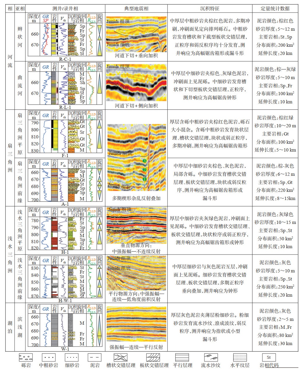 基于测井/录井相、地震反射特征、钻井岩心观察与岩相识别等分析结果,在Melut盆地Jimidi组共识别出河流、扇三角洲、浅水三角洲、湖泊等4种沉积相(图 6),并通过连井沉积相格架剖面对比以及地震相和地震属性分析,明确了不同沉积相的平面展布范围,主要发育以下几种岩相类型:槽状交错层理含砾中粗砂岩(Gt)、槽状交错层理中粗砂岩(St)、板状交错层理中粗砂岩(Sp);平行层理中粗砂岩(Sh)、流水沙纹层理细砂岩(Fr)和水平纹层泥岩(M)。