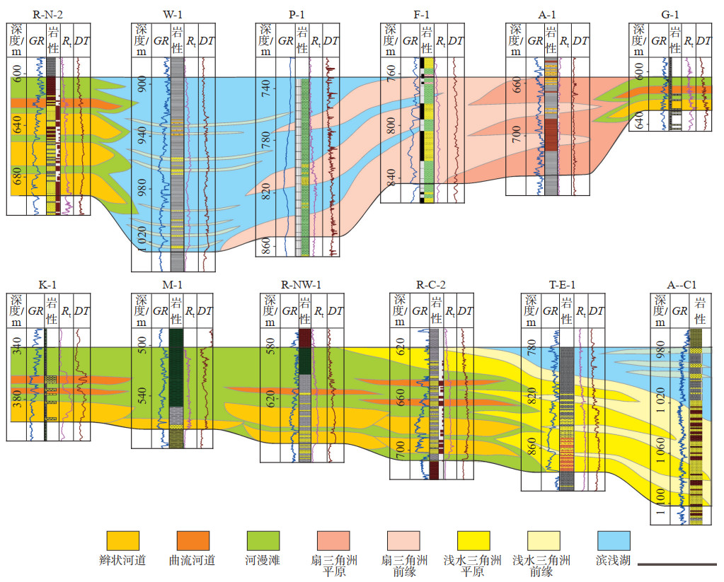 河流相可细分为辫状河和曲流河,其中研究区的辫状河沉积的岩性以中厚层中—粗砂岩为主,夹棕红色泥岩,多期冲刷,冲刷面见定向排列砾石,单层砂体厚度为5~12 m,主要岩相类型为槽状和下截型板状交错层理中—粗砂岩,正粒序和弱反粒序均发育;测井响应为高幅锯齿箱形或漏斗形,地震剖面上表现多表现为U型下切,河道具有宽度大、下切深度中等、近似对称的特点,河道内部充填以垂向加积为主。研究区内辫状河相主要分布于Kaka— Mooz地区,受西北部Kaka物源体系的影响,分布面积为200 km2,延伸长度为20 km。曲流河沉积的岩性主要为中厚层中—细砂岩,夹棕色、灰绿色泥岩,冲刷面上见泥砾,单层砂体厚度为5~10 m,岩相类型为槽状和下切型板块交错层理中—细砂岩,以正粒序为主;测井响应为高幅锯齿钟形,地震剖面上表现为W型下切,宽深比小于辫状河,河道不对称,河道内部充填以侧向加积为主。曲流河沉积相主要分布于Mooz—Ruman地区,同样受西北部Kaka物源体系的影响,因地形变缓、坡降减小,发生辫—曲转换,由近物源区的辫状河沉积转换为远物源区的曲流河沉积,曲流河沉积的分布面积约为100 km2,延伸长度约为10 km(图 7)。