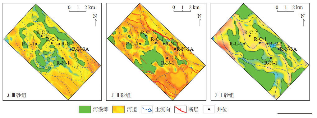 4 源—汇系统研究的勘探意义Melut盆地Ruman地区Jimidi组物源方向和沉积体系类型一直以来存在争议,制约了有利砂体与低孔封隔带的精细刻画,尽管该地区已发现稠油油藏多年,但一直按照构造圈闭控藏的思路进行部署,难以发现规模储量。基于源—汇系统定量-半定量研究结果,准确预测Jimidi组沉积时期Ruman地区为西北部的Kaka—Ruman源—汇系统的一部分,沉积体系类型属于河流相,主力砂体近似呈北西—南东向展布,河道间存在河漫滩细粒沉积低孔封隔带(图 8)。受古地貌和基准面变化的影响,Jimidi组河流型具有“曲—辫—曲”的垂向演化特征[22],J-Ⅲ砂组沉积中期基准面旋回以沟谷地貌控制下的曲流河砂体(单砂体厚度为5~10 m,孔隙度为18%~24%)为特征,存在近连续分布的北西—南东向河漫滩相对低孔封隔带。J-Ⅰ砂组沉积中期基准面旋回再次转换为曲流河型(单砂体厚度5~ 8 m,孔隙度18%~22%),砂体呈条带状展布,发育多套北西—南东向河漫滩相对低孔封隔带。鉴于稠油油藏多以构造-岩性油藏为主,相对低孔封隔带控制构造-岩性圈闭的边界,高孔砂岩控制稠油油藏富集。J-Ⅲ砂组沉积和J-Ⅰ砂组沉积中期基准面旋回砂体横向变化较大且存在侧向低孔封隔带和顶、底板盖层条件,易于形成大面积、非连续构造-岩性稠油油藏,据此部署的R-L-1风险探井获得勘探突破,扩大含油面积近30 km2,而J-Ⅱ砂组砂体横向连续性强,侧向低孔封隔带不发育,是构造油藏发育层段,不具备岩性油藏的勘探潜力。