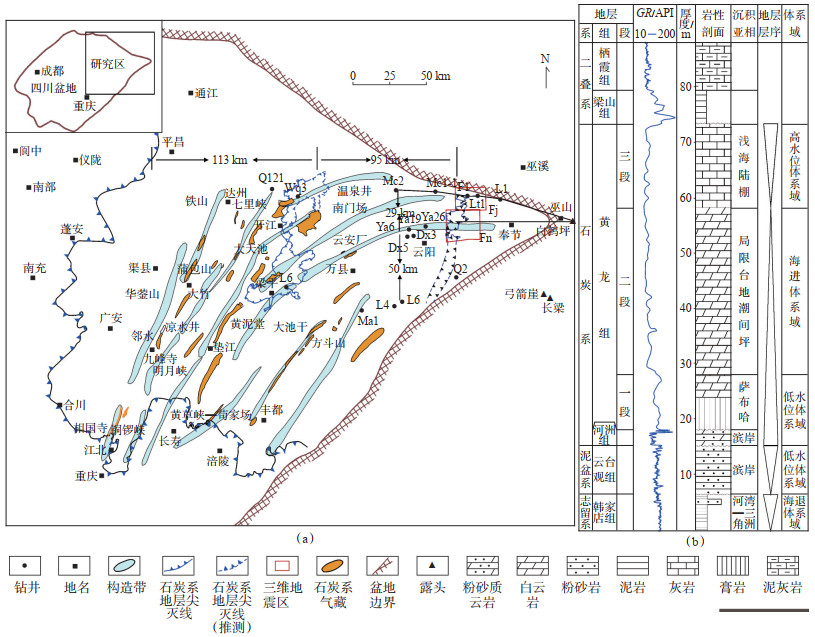 下载原图 图 1 四川盆地东部地质概图(a)与上古生界综合柱状图(b)[16, 24] Fig. 1 General geological map(a)and comprehensive stratigraphic column(b)of Upper Paleozoic in eastern Sichuan Basin |
