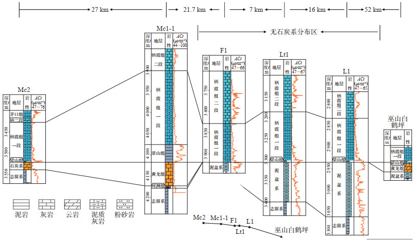 在四川盆地东部地区的F1,Lt1等井以南有已钻井分布,向南约29 km的云安厂构造(参见图 1)中,石炭系黄龙组存在自西向东变薄的现象,黄龙组在该构造内的Ya6井中厚度为35.5 m,在Dx3井中厚度为57 m,在Dx3井以东约10 km处的Ya26井中厚度仅为6 m。由于Ya26井与Mc1-1井东西向水平距离为7 km,与F1井距离为27 km,判断认为Ya26井尚不在奉节古隆起的主体部位,但已经非常靠近。以此推测认为奉节古隆起有向F1井以南发育的可能。万云强等[39]对云安厂构造以南约50 km处的龙驹坝构造的研究表明,该构造内L4井至L6井的黄龙组地层呈变薄趋势,碎屑物含量逐渐增多,构造东侧41 km处的Q2井黄龙组缺失,Q2井以东66 km处的建始长梁露头中发现了17 m厚的黄龙组,这与图 2的连井特征非常相似。
