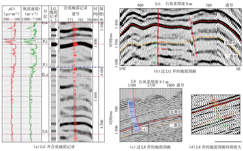 4 奉节古隆起的刻画古隆起边界刻画研究较为复杂,许多学者倾向于在构造认识的基础上给出一个较为主观的轮廓,但其并不能清楚地确定古隆起的具体展布特征。本文针对四川盆地东部地层的结构变化特征,基于正演模型[40],利用新处理的三维地震数据来确定三维区古隆起的轮廓并刻画其平面展布规律。上文中提到在Lt1井中未发现石炭系,通过地震波合成记录[图 3(a)]和地震剖面[图 3(b)]可知,其二叠系底界为一个中—弱波峰的上半叶,这与研究区大部分钻遇薄石炭系黄龙组(厚度小于10 m)的探井地震反射特征非常相似,均表现为中—弱反射[图 3(c),(d)],因此在未钻井之前,很容易误认为Lt1井发育薄层石炭系。造成这一错误认识的原因是地震反射波的地质解读具有多解性:①当中二叠统下伏地层为石炭系黄龙组时,地层速度大,约为6 500 m/s,相应的波阻抗也较大,可以在二叠系底部形成较强的波峰反射,而当黄龙组厚度较小时,对应的振幅也较弱。②当从下到上的地层结构从志留系—石炭系—二叠系变为志留系—泥盆系—二叠系时,由于地震波在泥盆系砂岩中的平均速度下降,为5 000 m/s,也能呈现中—弱波峰的反射特征。