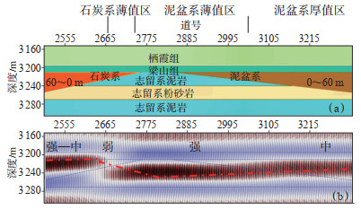 图 4(a)为根据研究区的地层特征,钻井、测井以及露头样品岩石物理测试数据设计出的地层模型正演剖面,其中两侧的石炭系和泥盆系呈楔形,厚度为0~60 m,反映这2套地层的剥蚀尖灭特征。从地震剖面[图 4(b)]上可明显看出,二叠系底界出现了4种反射特征:①石炭系较厚的时候,二叠系底界表现为强—中的波峰反射特征;②当石炭系较薄的时候,二叠系底界表现为弱的波峰反射特征;③当泥盆系较薄的时候,二叠系底界表现为强的波峰反射特征;④当泥盆系较厚的时候,二叠系底界表现为中等的波峰反射特征。其中②和④类似,容易把厚层泥盆系误认成薄层石炭系,在研究区天然气勘探过程中就出现过类似的误解,如F1井钻前预测有薄层石炭系存在,而实钻后证实仅发现了泥盆系,并没有石炭系。前期研究中,在盆地东部由于志留系—石炭系—二叠系中各系岩性变化大且单层厚度较为稳定,前2种反射特征在研究区较为普遍,通过二叠系底界振幅变化可以确定石炭系平面分布[27]。盆地东部边缘钻遇泥盆系的3口深井,整体岩性为粉砂岩,弹性参数变化不大,所以后2种反射特征在盆地东部边缘带具有区域代表意义,能满足平面研究的需求。