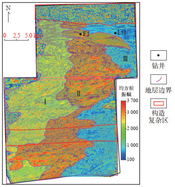 下载原图 图 5 四川盆地东部Fj和Fn三维区二叠系底界均方根振幅平面分布 Ⅰ. 无泥盆系区;Ⅱ. 薄泥盆系区;Ⅲ. 厚泥盆系区 Fig. 5 Plane distribution of root mean square amplitude of the bottom Permian in Fj and Fn 3D region, eastern Sichuan Basin |