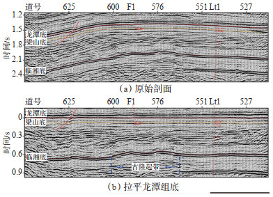 前期学者们认为二叠系龙潭组煤系地层沉积时地势平缓[1, 36],这可以作为恢复二叠纪前构造的参考面。图 6为过F1井和Lt1井的三维地震剖面,将龙潭组底界拉平后,在F1井和Lt1井下方可见志留系隆起(图中标识为临湘组底界),这说明奉节古隆起可能是一个早期的隆起。上文中已说明L1— Lt1—F1井区泥盆系成楔形变薄的特征,推测该隆起在泥盆系已经存在,并且控制了泥盆系残余地层的分布。
