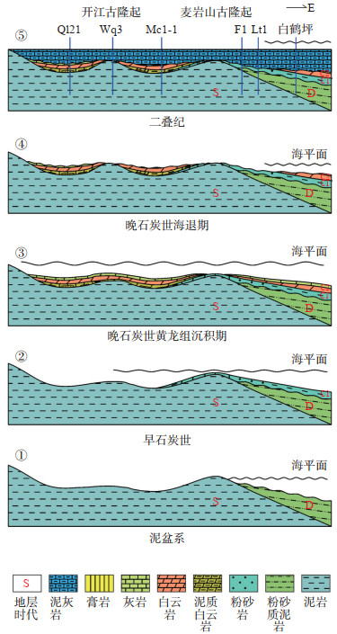 四川盆地东部地区发育2个古隆起:开江古隆起和奉节古隆起,其中开江古隆起距离盆地内的乐山—龙女寺古隆起约113 km,奉节古隆起距开江古隆起约95 km,通过残余地层分布和古构造恢复可知,研究区的构造演化可分为5个阶段(图 7):①泥盆纪低位期。泥盆系在奉节古隆起以东沉积,沉积后遭受剥蚀。②石炭纪低位期。下石炭统河洲组沉积跨越奉节古隆起,终止于开江古隆起东侧。③石炭纪海进—高位期。上石炭统黄龙组进一步海泛,已跨过开江古隆起,周缘形成障壁,造成膏湖和膏云湖沉积;中期海平面扩大形成障壁海湾,沉积一套局限白云岩;晚期进入高位期,形成开阔相灰岩。④石炭纪海退期。黄龙组沉积后,海平面下降,黄龙组遭到广泛剥蚀,在古隆起地区石炭系几乎剥蚀殆尽,凹陷区尚残留30~50 m地层。⑤二叠纪海进期。下二叠统梁山组在四川盆地东部普遍沉积,但在奉节古隆起北部部分缺失;栖霞组一段在奉节古隆起区略薄,随后古隆起消失。这个演化过程说明了在生油高峰期(三叠纪)[32]之前,研究区石炭系可以在奉节古隆起的控制下产生地层尖灭线,进而形成有效的地层圈闭。