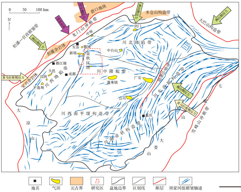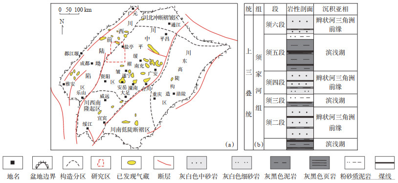 1 地质概况金秋区块位于四川盆地西北部,构造位置位于川中古隆起平缓褶皱带到川西前陆拗陷区的斜坡过渡带,面积约4 067 km2(图 1)。研究区上三叠统须家河组为内陆河湖交替的碎屑岩沉积体系,厚度为900~1 700 m,自下而上可分为6段,其中须一段、须三段和须五段均为滨浅湖相粉砂质泥岩含煤沉积,以灰黑色泥岩为主,夹薄层粉砂岩和煤层,须二段、须四段和须六段均发育一套辫状河三角洲前缘沉积,岩性主要为灰白色中—细砂岩。须一段、须三段和须五段构成的主力烃源岩和区域盖层与须二段、须四段、须六段储层互相叠置,呈“三明治”结构和广覆式分布的特点,有利的生储盖组合特征为油气大范围富集成藏提供了便利条件[8-9]。
