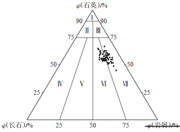 下载原图 图 2 金秋区块须二段砂岩成分三角图 Ⅰ. 石英砂岩;Ⅱ. 长石石英砂岩;Ⅲ. 岩屑石英砂岩;Ⅳ. 长石砂岩;Ⅴ. 岩屑长石砂岩;Ⅵ. 长石岩屑砂岩;Ⅶ. 岩屑砂岩 Fig. 2 Triangular diagram illustrating sandstone composition of the second member of Xujiahe Formation in Jinqiu block |