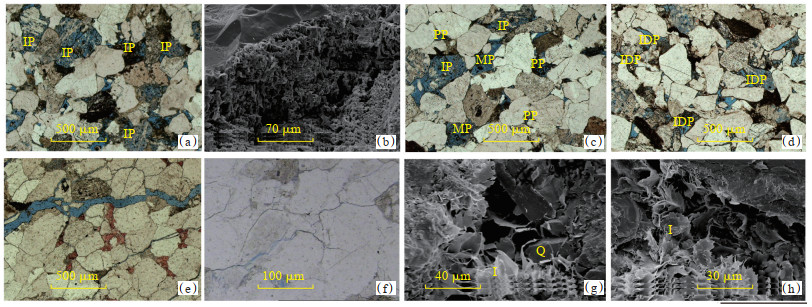 下载原图 图 3 金秋区块须二段储层孔隙和喉道镜下特征 (a)中粒岩屑砂岩,长石、岩屑粒内溶孔(IP),JH-3井,3 387.0 m,铸体薄片单偏光;(b)钾长石沿解理面溶蚀形成蜂窝状粒内溶孔,PX-1井,2 871.5 m,扫描电镜;(c)中粒岩屑砂岩,长石被溶蚀形成粒内溶孔(IP)、铸模孔(MP),可见原生粒间孔(PP),JH-3井,3 358.0 m,铸体薄片单偏光;(d)沿颗粒边缘发育粒间溶孔(IDP),Jin-31井,3 179.9 m,铸体薄片单偏光;(e)微裂缝,还有少量粒间溶蚀孔和杂基孔,Qiu-1井,3 289.1 m,铸体薄片单偏光;(f)微裂缝沿颗粒边缘或切穿颗粒内部,PX-1井,2 866.4 m,铸体薄片单偏光;(g)残余原生粒间孔,粒间发育片状、丝缕状伊利石(I)、自生石英(Q),PL-2井,2 724.1 m,扫描电镜;(h)片状喉道,充填片状、丝缕状伊利石(I),PX-1井,2 889.1 m,扫描电镜 Fig. 3 Microscopic features of pores and throats of the second member of Xujiahe Formation in Jinqiu block |