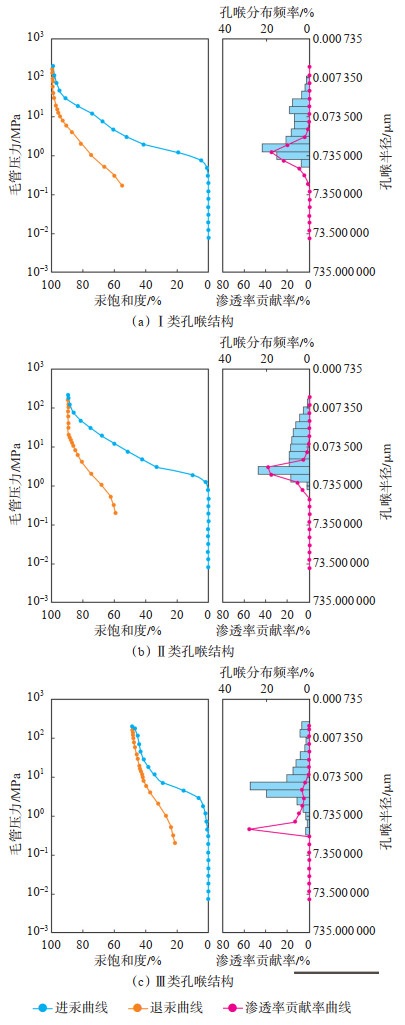 下载原图 图 4 金秋区块须二段各类孔喉结构典型压汞曲线及其对应的渗透率贡献率与孔喉半径分布关系图 Fig. 4 Typical capillary pressure curves of different types of pore structure and their permeability contribution, and pore throat radius distribution of the second member of Xujiahe Formation in Jinqiu block |