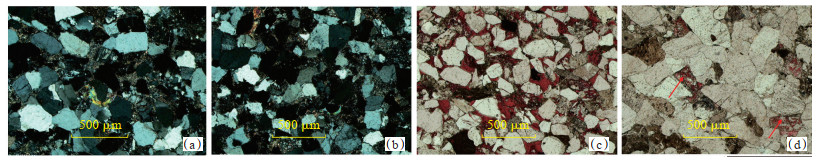 下载原图 图 7 金秋区块须二段储层成岩作用典型微观特征 (a)中粒长石岩屑砂岩,颗粒呈点—线接触,云母弯曲变形,少量石英次生加大,压实作用较强,JH-3井,3 482.0 m,正交偏光;(b)颗粒呈线—凹凸接触,粒间由黏土杂基、硅质(石英加大边)胶结物填隙,强压实压溶作用,JH-3井,3 425.0 m,正交偏光;(c)颗粒间由连晶方解石胶结物及黏土杂基填隙,JH-3井,3 545.2 m,铸体薄片,单偏光;(d)长石、岩屑粒内溶孔被含铁方解石(红色箭头所指)充填,JH-3井,3 429.0 m,铸体薄片,单偏光 Fig. 7 Microscopic diagenetic features of the second member of Xujiahe Formation in Jinqiu block |
