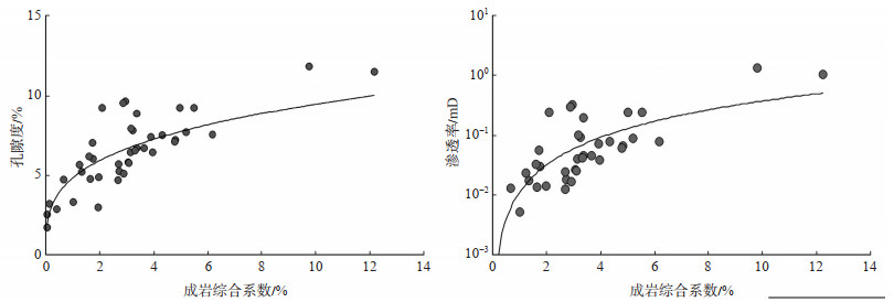 成岩相是沉积物在一定的地质条件下经历一定成岩作用和演化阶段的产物,包括岩石颗粒、胶结物、组构、孔洞缝等综合特征[30]。根据成岩作用类型、强度和对储层物性的建设或破坏作用将研究区须二段储层划分为4种成岩相类型,分别为成岩微裂缝相、不稳定组分溶蚀相、自生矿物胶结相、强压实成岩相。成岩综合系数是评价储层物性的定量化成岩参数,通过建立成岩综合系数与储集层物性的关系,二者相关性较好(成岩综合系数与孔隙度相关系数为0.715 1,成岩综合系数与渗透率相关系数为0.514 6),总体上随着成岩综合系数的增大,储层孔隙度和渗透率均呈增大趋势,从而也验证了成岩综合系数对划分储层成岩相的有效性(图 8)。
