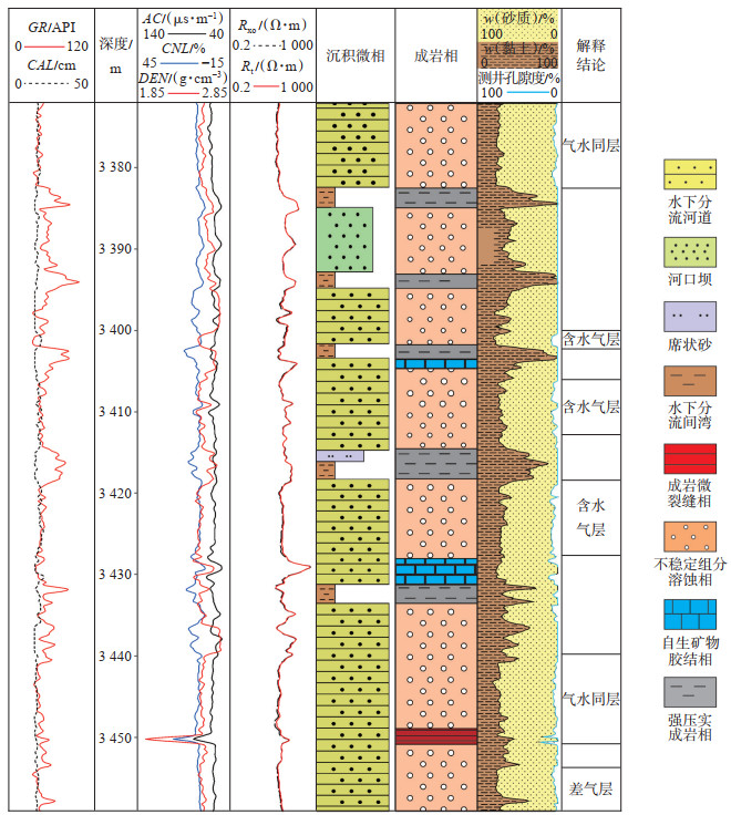 成岩微裂缝相是指以裂缝和微裂缝为主要储集空间的储层,具有Ⅰ类孔喉结构,裂缝和微裂缝对物性有显著的改善作用,在常规测井曲线上表现为中低密度、高电阻率,高声波时差的特征。不稳定组分溶蚀相指砂岩中不稳定组分(长石、岩屑等)被溶蚀形成次生孔隙,孔隙类型以粒内溶孔和粒间溶孔为主,孔喉结构为Ⅰ,Ⅱ类,物性较好,测井曲线响应特征为低自然伽马、低密度、中等中子测井值,成岩综合系数为1.2%~12.2%。自生矿物胶结相是沉积物经历较强胶结作用或者溶蚀产物充填于粒内溶孔和粒间溶孔中,主要包括硅质、钙质、黏土矿物胶结等3类,使储层物性变差,孔喉结构变得复杂,以Ⅲ类为主,成岩综合系数为0.8%~2.3%。硅质胶结在测井曲线上表现为低自然伽马、中低声波时差、中高密度;钙质胶结物呈薄层状分布于与泥岩相毗邻的砂体中,测井曲线表现为低自然伽马、低声波时差、低中子、高密度,电阻率具有明显的“钙尖峰”;黏土矿物胶结在测井上表现为高自然伽马值,高中子孔隙度,低密度值。强压实成岩相物性差或不具备储集性能,成岩综合系数 < 0.8%,测井曲线响应特征为中高自然伽马值,中高密度,高中子值,中低声波时差。以四川盆地金秋区块JH-3井须二段为例,其纵向上由多期三角洲前缘亚相厚层块状砂岩叠置(图 9),不同沉积时期砂体间或同期砂体内部的沉积韵律、微相组合、成岩相类型及组合等均存在差异,表现出较强的非均质性。水下分流河道微相和河口坝微相发育成岩微裂缝相、不稳定溶蚀成岩相和自生矿物胶结相,微裂缝提高了储层物性和含气性,不稳定组分溶蚀相对应的孔隙度较高,解释结果为气水同层或含水气层,与测试资料较符合,而自生矿物胶结作用对储层的物性具有一定破坏作用。席状砂微相、水下分流间湾微相由细砂岩、粉砂岩和泥岩组成,对应强压实成岩相,其岩心孔隙度 < 5%。综上所述,沉积相、成岩相和储层物性三者关系密切,储层物性受沉积相和成岩相双重控制,沉积作用和沉积相是决定能否成为储集岩及储集性能好坏的先天性条件,而成岩作用导致其逐渐形成现今的低孔低渗性储集体以及较强的微观非均质性。