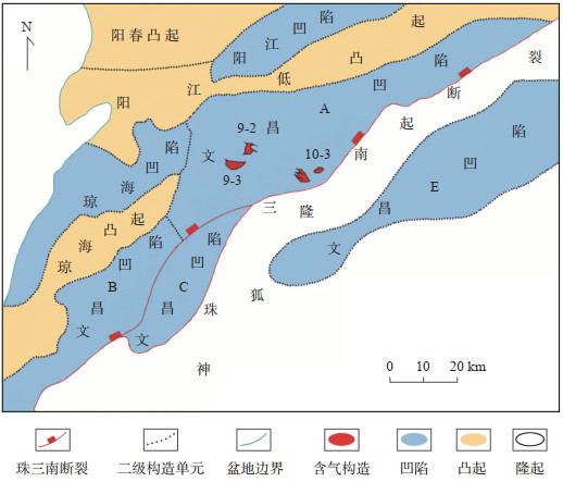 1 地质概况文昌A凹陷位于珠江口盆地西部的珠三坳陷内,其南北分别与神狐隆起和阳江低凸起相接,西邻琼海凸起、琼海凹陷以及文昌B,C凹陷(图 1)。在珠三南断裂和六号断裂带的控制下,凹陷内发育一个构造隆升带及2个沉降中心[12]。根据前人的研究,文昌A凹陷主要存在2套储层,分别为晚渐新世的珠海组以及早中新世的珠江组,其中珠海组为本次研究的目的层;存在2期油气充注,第一期石油注入珠海组三段储层,第二期注入珠海组一段储层,大量天然气注入更晚。研究区气田群为南海西部首个整体开发的低渗、特低渗凝析气田群,其中含有大量低对比度储层,识别难度较大。