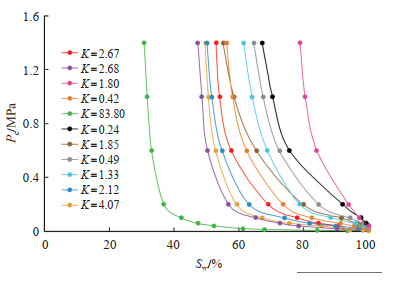 3.1.1 束缚水饱和度Swi半渗透隔板法和压汞法为目前测量毛细管压力曲线应用最普遍的方法[17],本文的实验研究中,毛细管压力的测定采用半渗隔板法。半渗透隔板法与常用的压汞法、离心法相比,能更准确地描述实际气藏原始含水饱和度的分布状态。根据11块半渗透隔板实验测得的毛管压力曲线资料确定岩样的束缚水饱和度值(图 2),研究区各岩样含水饱和度均随毛细管压力Pc的增大而降低,当实验毛细管压力达到最大值1.4 MPa时,含水饱和度随毛细管压力的变化不再明显,因此,可以将毛细管压力为1.4 MPa时所对应的含水饱和度作为该岩样的束缚水饱和度。