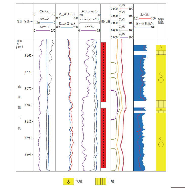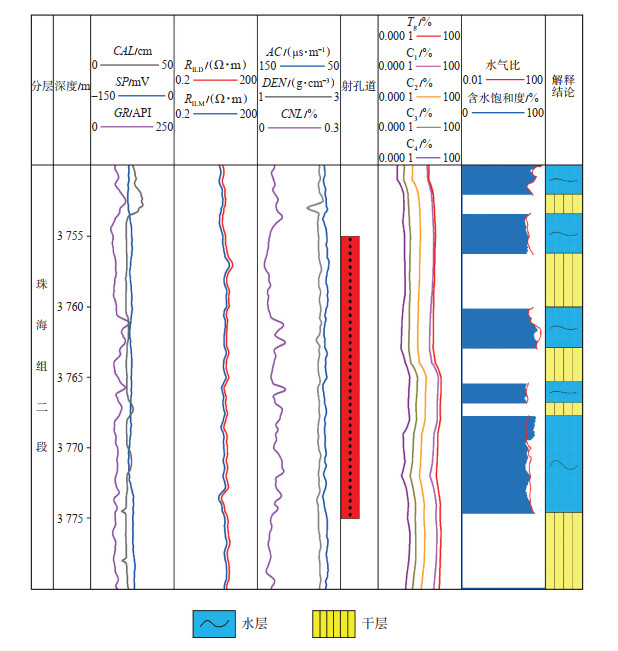 下载原图 图 7 文昌A凹陷WC9-2-1井珠海组二段储层水气比流体识别解释图 Fig. 7 Recognition and interpretation of water-gas ratio fluid of the second member of Zhuhai Formation in well WC9-2-1 in Wenchang A sag |