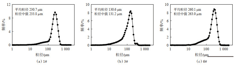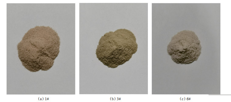 1 实验方法 1.1 实验样品及流体本次研究共收集到3种预交联凝胶颗粒样品,分别为1#,3# 和6#。首先对各凝胶颗粒进行干燥、破碎,然后采用标准筛将样品筛选成425~600 μm,212~425 μm,150~212 μm,106~150 μm,90~106 μm和75~90 μm粒径范围的实验样品(图 1)。从外观上来看,各预交联凝胶颗粒有较大差异,1# 呈红褐色,3# 呈土灰色,6# 呈白色。