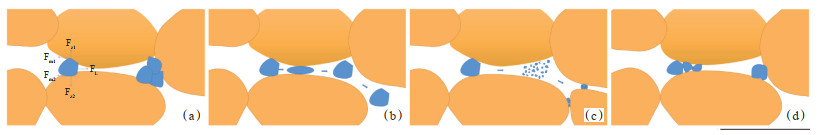 预交联凝胶颗粒在多孔介质中的运移特征受多种因素的影响,其运移机理比较复杂。根据以往的研究成果,当凝胶颗粒的尺寸大于孔喉直径时,颗粒的运移特征较为复杂[14]。本次研究中,微观模型的喉道尺寸远小于凝胶颗粒尺寸。结合本次微观模型实验结果,将凝胶颗粒在多孔介质中的运移与封堵模式分为完全封堵、变形通过、剪切破碎和架桥/重合封堵(图 10)。当凝胶颗粒运移至较小的孔喉时,可在孔喉处形成封堵,凝胶颗粒所受的力主要包括流体对颗粒的曳力FL,壁面对凝胶颗粒的支撑力Fz1和Fz2,壁面作用于凝胶颗粒的摩擦阻力Fm1和Fm2 [图 10(a)]。随着驱动力的增加,颗粒在孔喉中运移,其变形量不断变大,所受附加流动阻力也变大,二者同时达到最大值,其后一旦通过孔喉最狭窄部分,附加流动阻力减小,颗粒变形通过孔喉后继续运移[图 10(b)]。在高强度的挤压剪切作用下,当颗粒在孔喉中运移时,弹性形变超过最大限度后,将破碎成无规则的小尺寸凝胶颗粒[图 10(c)]。当颗粒数量较多,压实程度很高,且驱替压差小于最大附加流动阻力时,颗粒就会以重合/架桥方式对孔喉形成完全封堵[6, 15][图 10(d)]。凝胶颗粒在地层中运移时可能是几种运移封堵模式的综合。