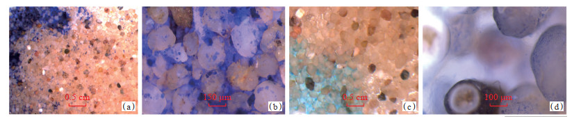 下载原图 图 11 凝胶颗粒对孔喉的封堵特征 (a)1# 凝胶颗粒在喉道处形成封堵(7×);(b)3# 凝胶颗粒对孔喉的封堵(40×);(c)6#凝胶颗粒在喉道处形成封堵(7×);(d)6# 凝胶颗粒对孔喉封堵(80×) Fig. 11 Characteristics of plugging of pore-throat by gel particles |
