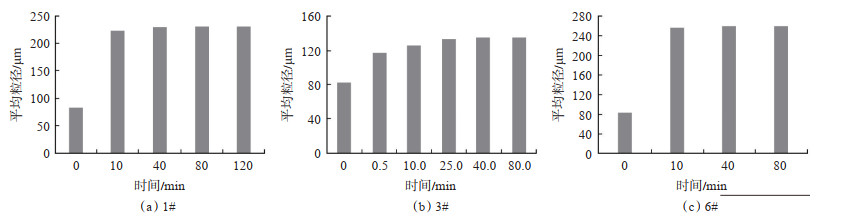 预交联凝胶颗粒吸水溶胀的性能直接影响着其对岩石孔隙喉道的封堵能力,是表征预交联凝胶颗粒性能的重要参数。如图 5所示,75~90 μm的3# 颗粒在吸水溶胀后粒径主要分布在100~200 μm;75~90 μm的6# 颗粒在吸水溶胀后粒径主要分布在200~400 μm;75~90 μm的1# 颗粒在吸水溶胀后粒径主要分布在200~300 μm。图 6为粒径75~90 μm的预交联凝胶颗粒吸水溶胀后的平均粒径随时间的变化。从图 6中可以看出,75~90 μm的各预交联凝胶颗粒吸水后,10 min以内溶胀速度较快。