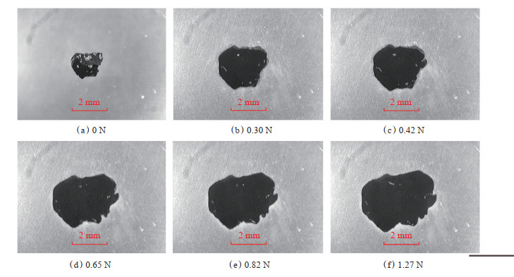 采用凝胶颗粒性能分析仪获得了各凝胶颗粒在不同压力条件下的投影图像。图 7为6# 凝胶颗粒的弹性变形图像,可以看出,6# 凝胶颗粒在不同压力作用下发生了弹性变形。1# 和3# 凝胶颗粒在不同压力下均发生了弹性变形。