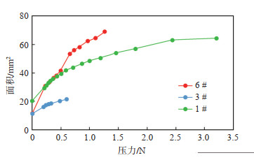 图 8为各凝胶颗粒投影面积随压力的变化规律曲线,可以看出,各凝胶颗粒的投影面积随压力呈现增加趋势。图中曲线斜率代表各凝胶颗粒弹性变形快慢,1# 和3# 弹性变形速度相对较慢,6# 弹性变形速度较快。根据式(1)计算得到的颗粒弹性因子如表 5所列。3 # 弹性因子最大,即较难发生弹性变形,其次为1# 颗粒,6# 的弹性因子最小,即弹性变形能力最强。3种凝胶颗粒的弹性变形能力从强到弱依次为6#,1#,3#,这和凝胶颗粒的溶胀能力强弱关系完全相符。在颗粒弹性测试过程中,当压力加载到一定程度,即大于投影面积曲线上最后一个压力点时,凝胶颗粒会被挤压破碎,因此,将此压力点定义为单颗粒的抗压强度,意即单凝胶颗粒所能承受的最大压力。从表 5中各凝胶颗粒的抗压强度可以看出,6# 抗压强度最小,其次为3#,1# 抗压强度最大,这和前面抗压强度测试结果完全相符。
