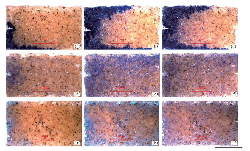 图 9(c)为注水后A模型中1# 凝胶颗粒的分布,对比图 9(b)和图 9(c)可以看出,凝胶颗粒在注入水的冲刷作用下,几乎没有发生运移,说明1# 凝胶颗粒对孔喉形成永久性封堵,具有较好的封堵效果。图 9(f)为注水后F模型中3# 凝胶颗粒的分布,与注水前模型中凝胶颗粒的分布相比,3# 凝胶颗粒在注入水的冲刷作用下,部分发生运移,即被注入水带走,多孔介质中凝胶颗粒数量明显减少,这将对3# 凝胶颗粒对孔喉的封堵效果产生影响。图 9(i)为注水后E模型中6# 凝胶颗粒的分布。对比图 9(h)和图 9(i)可以看出,6# 凝胶颗粒在注入水的冲刷作用下,其在模型中的分布没有发生明显的变化,说明6# 凝胶颗粒对孔喉形成永久性封堵,具有较好的封堵效果。