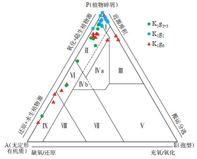 下载原图 图 6 红柳峡地区下沟组孢粉有机质组成A-P-E三元图 Ⅰ. 高能近源环境;Ⅱ. 边缘贫氧—厌氧环境;Ⅲ. 多粗碎屑沉积的充氧近源环境;Ⅳ. 陆架与陆棚的过渡区(Ⅳa为低氧,Ⅳb为低氧—缺氧);Ⅴ. 多细碎屑沉积的充氧远源环境;Ⅵ. 近源低氧—贫氧环境;Ⅶ. 远源低氧陆架;Ⅷ. 远源贫氧—缺氧环境;Ⅸ. 远源缺氧环境 Fig. 6 A-P-E ternary diagram of organic matter composition of Xiagou Formation in Hongliuxia area |