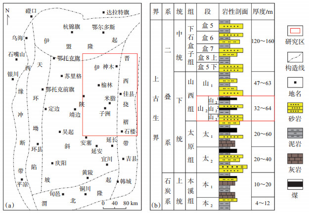 1 区域地质概况研究区位于鄂尔多斯盆地东部,北起神木以北,南至石楼,西跨横山,东越佳县,涉及伊陕斜坡和晋西挠褶带两大构造单元[图 1(a)]。早二叠世山西期,海西运动引起的板块碰撞、挤压致使华北地块抬升,海水从鄂尔多斯盆地东西两侧开始逐渐退出,致使盆地整体由海相沉积向陆相沉积转变。因此,鄂尔多斯盆地整体处于海陆过渡相沉积,陆相发育河流、三角洲沉积[15-16],海相发育碳酸盐岩沉积[17-18]。山西组早期以陆表海沉积为主,发育潮控浅水三角洲;山西组末期,发生大规模海退,盆地北高南低的差异沉降格局基本形成,盆地内的沉积逐渐转变为河流—三角洲沉积体系[19]。山西组的沉积厚度达100 m左右。在地层接触关系方面,研究区内山西组与上覆下石盒子组呈整合接触或冲刷面接触,与下伏太原组呈区域冲刷面接触,岩性组合和沉积旋回自上而下划分为山1段和山2段,其中山2段又可细分为山21、山22及山23等3个小层[20-21] [图 1(b)]。