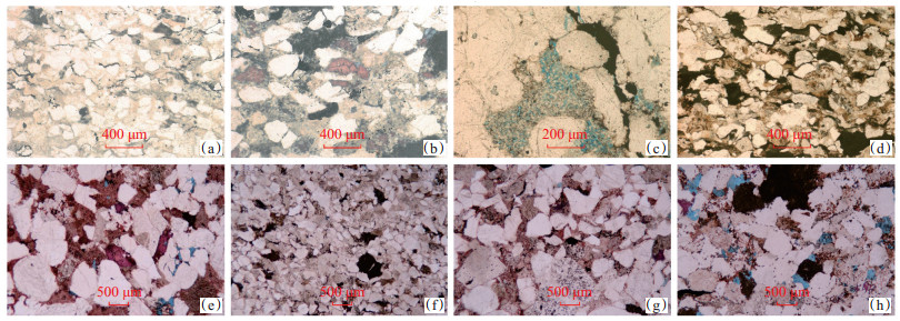 下载原图 图 2 鄂尔多斯盆地东部山2段致密砂岩储层岩石类型及结构特征 (a)细粒岩屑石英砂岩,M100井,山23,2 225.4 m;(b)中粒岩屑石英砂岩,S113井,山22,2 592.2 m;(c)中粒石英砂岩,Y29井,山23,2 508.6 m;(d)细粒岩屑砂岩,S26井,山21,2 084.2 m;(e)浅灰色含高岭石粗粒岩屑石英砂岩,分选、磨圆中等,S114井,山21,2 722.3 m;(f)褐灰色中粒岩屑石英砂岩,分选好,磨圆中等,M140井,山23,2 100.6 m;(g)浅灰色中-粗粒岩屑石英砂岩,分选磨圆中等,S114井,山21,2 718.7 m;(h)浅灰色粗粒岩屑石英砂岩,分选、磨圆中等,M132井,山22,2 672.3 m Fig. 2 Rock types and structural characteristics of tight sandstone reservoirs of the second member of Shanxi Formation in eastern Ordos Basin |