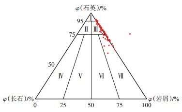 下载原图 图 3 鄂尔多斯盆地东部山2段致密砂岩储层岩石组分三角图 Ⅰ. 石英砂岩;Ⅱ. 长石石英砂岩;Ⅲ. 岩屑石英砂岩;Ⅳ. 长石砂岩;Ⅴ. 岩屑长石砂岩;Ⅵ. 长石岩屑砂岩;Ⅶ. 岩屑砂岩 Fig. 3 Triangular diagram of rock composition of tight sandstone reservoirs of the second member of Shanxi Formation in eastern Ordos Basin |