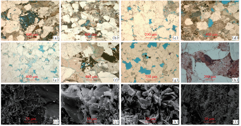 下载原图 图 4 鄂尔多斯盆地东部山2段致密砂岩储层孔隙镜下特征及扫描电镜照片 (a)粒内溶孔,细砂岩,S393井,山22;(b)粒内溶孔,中-细砂岩,M53井,山23;(c)粒间孔,中-细砂岩,Y29井,山23;(d)粒间孔,细砂岩,Y117井,山22;(e)晶间孔,细砂岩,S248井,山23;(f)微裂隙,巨砂质粗粒岩屑砂岩,B9井,山23;(g)粒间孔,细砂岩,S393井,山22;(h)晶间孔,细砂岩,M26井,山21;(i)粒内溶孔,粉砂岩,S142井,山22;(j)微裂隙,粉砂岩,S142井,山22;(k)高岭石晶间孔,细砂岩,Y98井,山23;(l)伊利石晶间孔,细砂岩,Y102井,山22 Fig. 4 Microscopic characteristics of pores and scanning electron micrographs photographs of tight sandstone reservoirs of the second member of Shanxi Formation in eastern Ordos Basin |