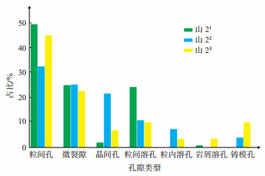 3 储集空间及成岩作用特征 3.1 储集空间特征铸体薄片镜下鉴定认为鄂尔多斯盆地东部山2段砂岩发育多种储集空间类型,包括粒间孔、铸模孔、粒内溶孔、晶间孔以及微裂缝等[图 4(a)—(h)],以粒间孔为主,而溶孔、微裂隙、晶间孔所占比例较少(图 5)。结合岩心样品压汞实验数据结果,山2段砂岩储层平均孔喉比为2.13,平均孔隙半径为150.3 μm,平均面孔率为2.87%,平均孔隙度为4.56%,平均渗透率为0.095 mD,平均分选系数为76.43,储层孔喉结构整体相对较好,微观孔喉非均质性相对较强。