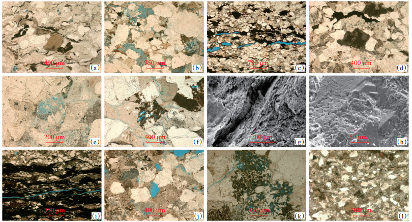 下载原图 图 6 鄂尔多斯盆地东部山2段成岩作用镜下特征 (a)塑性岩屑形变,M33井,山23;(b)颗粒定向排列,S14井,山22;(c)颗粒线接触,S13井,山22;(d)凹凸缝合线接触,Y102井,山21;(e)岩屑、长石溶蚀,S50井,山23;(f)粒内溶孔,B9井,山23;(g)碎屑溶蚀形成次生孔、裂纹缝,绢云母化,M38井,山22;(h)硅质碎屑发生溶蚀,Y117井,山23;(i)自生黏土、铁白云石及菱铁矿胶结,Y117井,山22;(j)高岭石、伊利石胶结,Y117井,山22;(k)伊利石胶结,S110井,山23;(l)泥晶白云石胶结,T15井,山22 Fig. 6 Microscopic characteristics of diagenesis of the second member of Shanxi Formation in eastern Ordos Basin |