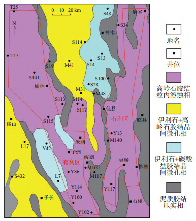 最终,基于成岩相的划分,鄂尔多斯盆地东部的高岭石胶结粒内溶蚀成岩相可形成相对有利的储层,其次为伊利石+高岭石胶结晶间微孔相,而成岩相的平面展布特征揭示出发育2个相对有利储层分布区,分别为乌拉庙—榆林—清涧地区和府谷—佳县—吴堡地区(参见图 7)。