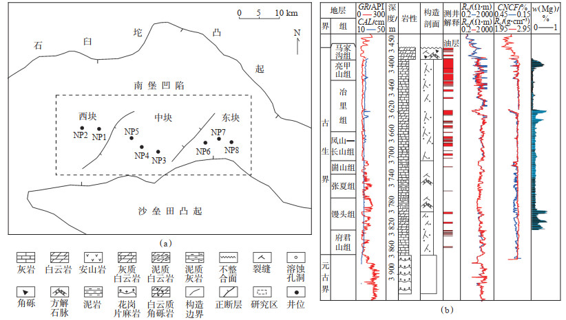 1 区域背景南堡凹陷二号断裂带位于渤海湾南堡凹陷西南端,受断裂控制分为东块、中块和西块[图 1(a)]。其中西块钻探了NP1和NP2井,中块钻探了NP3,NP4和NP5井,东块钻探了NP6,NP7和NP8井。根据8口井钻井揭示情况,古生界潜山地层至下而上分别为寒武系府君山组、馒头组、张夏组、崮山组、凤山-长山组、奥陶系冶里组、亮甲山组和马家沟组[图 1(b)]。含油层段较为集中,可分为上下2段,上段称为上油组,主要为马家沟组、亮甲山组、冶里组和凤山-长山组地层,下段称为下油组,主要为馒头组和府君山组地层。结合测试资料,3个区块油层发育程度及产能均有较大差异,中块在上油组和下油组均有油层发育,厚度分别为91 m和31 m,而东块和西块仅在上油组发育油层,厚度分别为120 m和29 m;3个区块仅在上油组进行了测试,西块、中块和东块平均日产油量分别为130 m3,310 m3和860 m3,反映出该区域潜山不同区块岩溶作用强度存在差异。